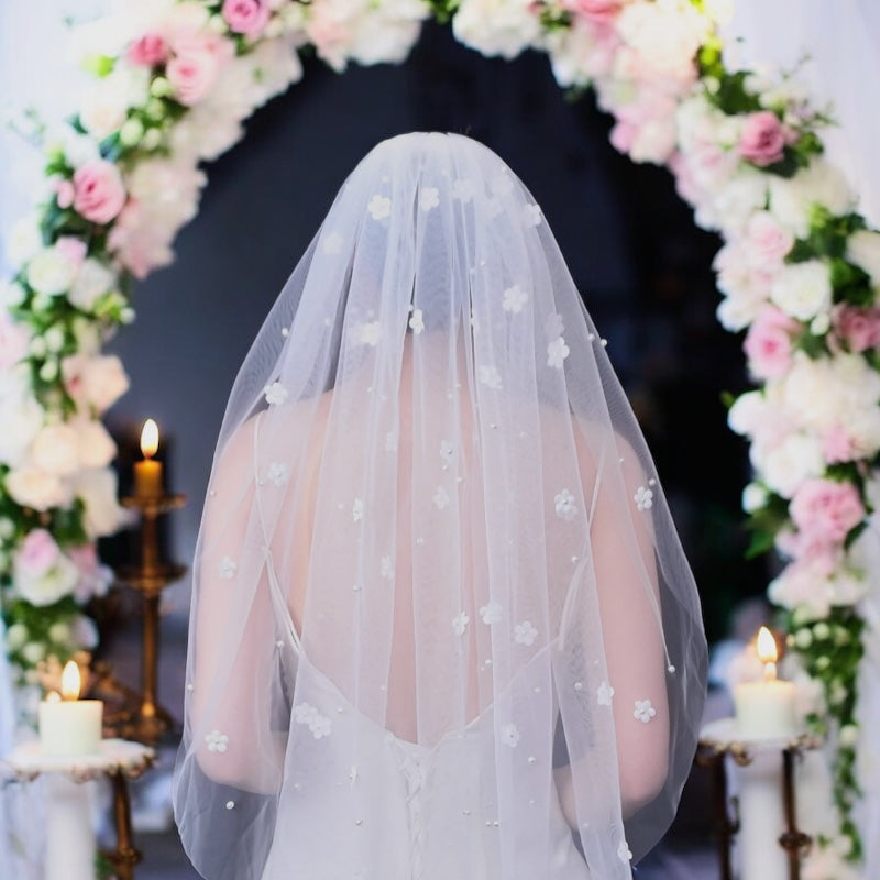 Add a touch of ethereal beauty to your bridal ensemble with the Anastasia veil, a luxurious one-layer wedding veil designed for the modern bride. This veil features delicate 3D flowers and elegant pearl beading, creating a romantic and sophisticated look that will captivate on your special day.