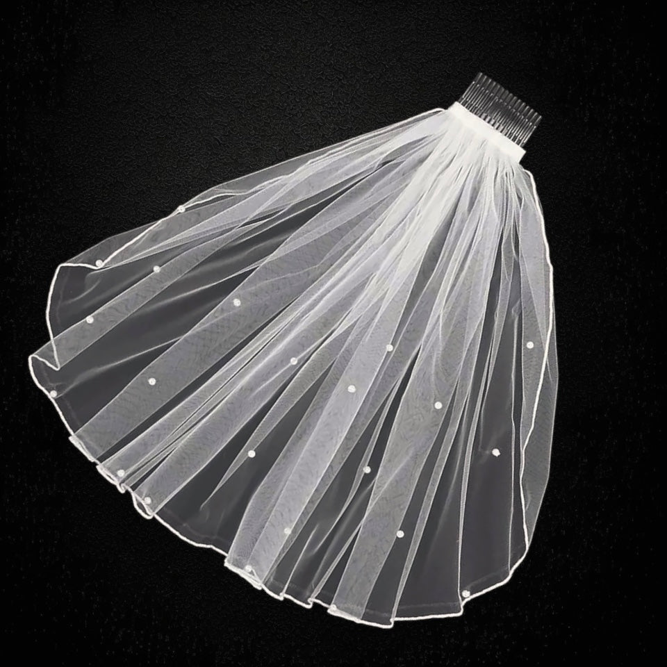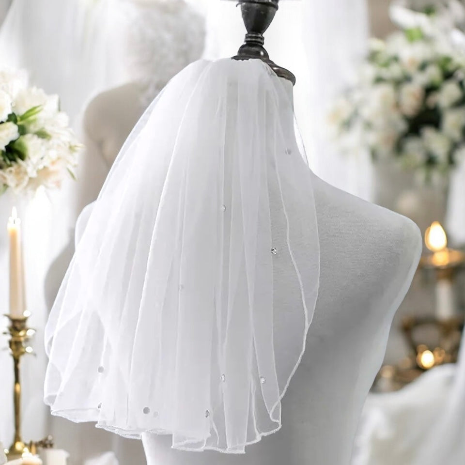 Design: Short, one-tier veil (38 cm length, 140 cm width) that elegantly frames the face and shoulders.