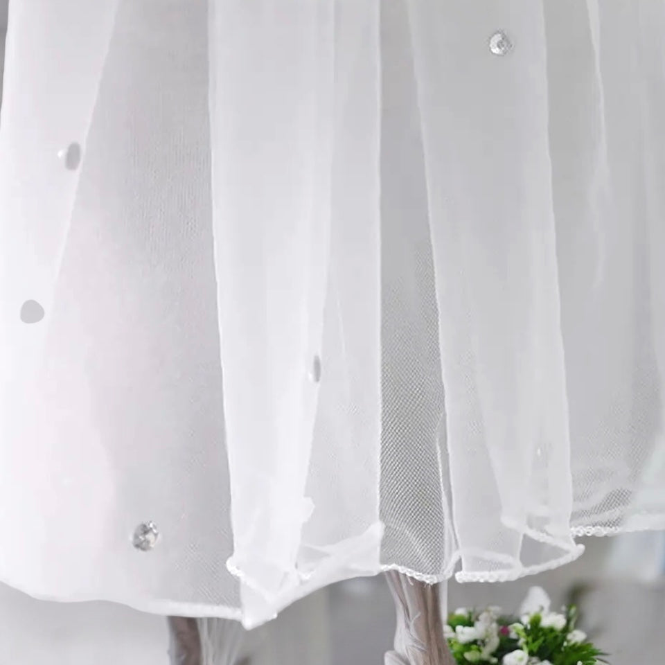 The Diana Bridal Veil is a stunning accessory that adds a touch of sparkle to your wedding day look. Made from soft acetate mesh, this short, one-tier veil is designed to delicately frame your face and shoulders, offering a sophisticated yet modern flair. Measuring 38 cm in length and 140 cm in width, it is designed to fit most women comfortably. The veil is adorned with shimmering crystals, providing a subtle yet captivating glimmer that enhances your bridal beauty. It comes with a built-in comb for easy and secure placement, ensuring it stays perfectly in place throughout your special day. Available in classic White or Ivory, the Diana veil is an elegant choice for weddings, parties, or any special occasion.