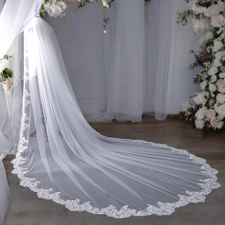 Complete your bridal look with the Scarlett One Layer Lace Bridal Veil, the perfect blend of simplicity and sophistication