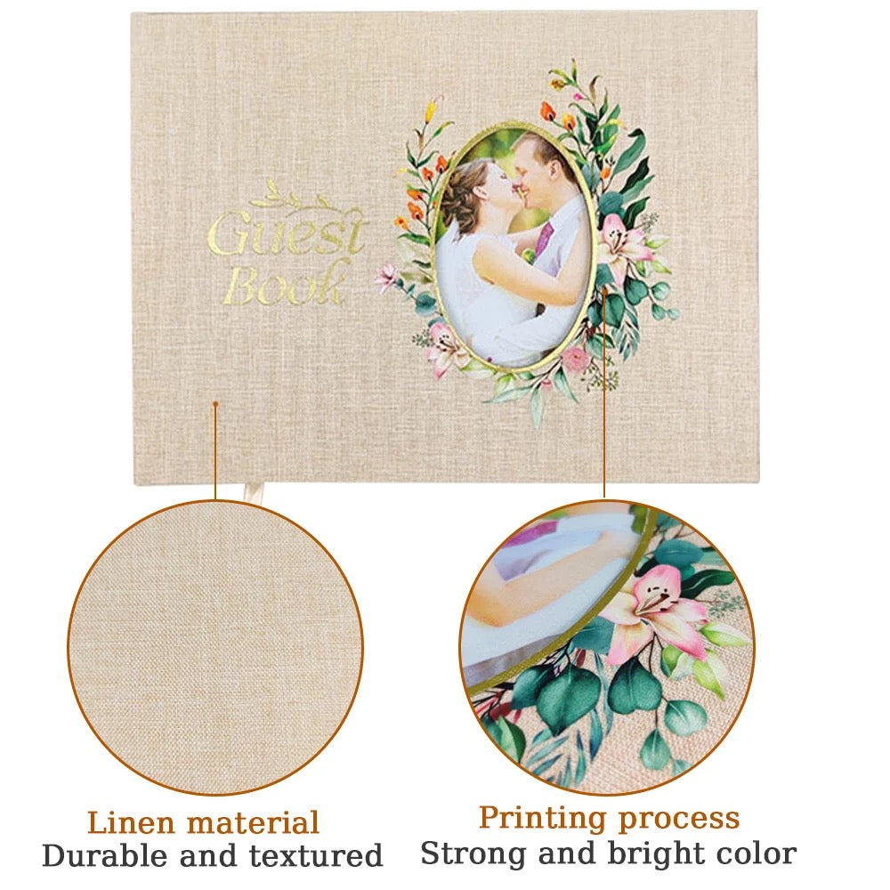 Elegant Design: The linen cover and gold photo frame add a touch of sophistication. Personalize it with your own photos to capture the special moments of your big day.